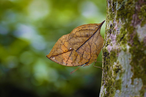 另一种例子是枯叶蝶,它合拢翅膀后看起来像一片带有脉络和斑点的棕色叶子。还有一种是尺蠖蛾,其浅灰色身体上点缀着些许黑色色素——这使得它们在栖息在覆盖着地衣的树上时很难被发现。