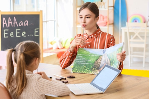 (图片来源:Monkey Business Images/Shutterstock) 老师使用学习辅助工具帮助患有阅读障碍症的学生