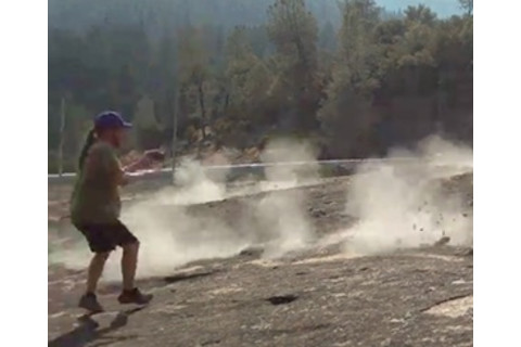 圆顶顶部是平的,而两侧则陡峭地延伸到一条小溪,距离圆顶顶部约 50 英尺。有一个小台阶,大约在溪流上方 5 英尺左右。所以我们三个人下了这个台阶。我俯身将眼睛放在裂缝前,就在我这样做的时候,发生了第二次断裂事件。我经历过很多次爆破,而这次爆破非常巨大。它真的很大声,而且非常、非常低沉。这是一个非常强烈、几乎爆炸性的事件;它将空气和灰尘吹进了我的眼睛,但我没事。
