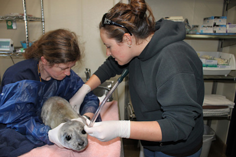 一只年幼的港海豹病人,虚弱得无法自行进食,通过管饲喂食。| Dina Warren