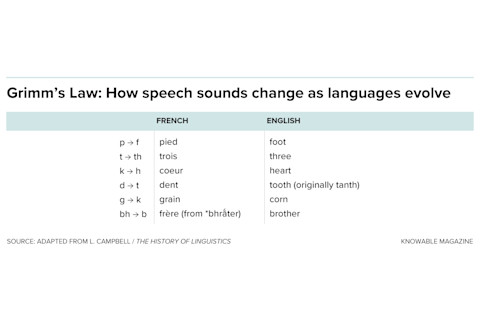 格林指出,随着语言的发展,语音会以规律的方式变化,这有助于理解语言之间的关系。例如,印欧语系中“二”的词是“dwo”。但是“dwo”是许多以“d”开头并在传入英语和德语的共同祖先时变为“t”的词之一。后来,“t”音在现代德语的祖先中变为“ts”。因此,印欧语系的“dwo”在英语中变为“two”,在现代德语中变为“zwei”(发音为“tsvai”)。其他以“d”音开头的词也表现出类似的规律。学者们发现了许多这样的语音变化模式,每种模式都遵循不同的规则,随着一种语言孕育出另一种语言。