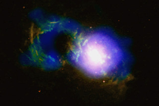 这张合成图像显示了 J1430+1339,即茶杯星系。可见光(红色和绿色)由美国宇航局的哈勃空间望远镜拍摄,X射线数据(蓝色)由美国宇航局的钱德拉X射线天文台收集。(来源:X射线:NASA/CXC/剑桥大学/G. Lansbury 等人;可见光:NASA/STScI/W. Keel 等人)您睡前喝的一杯洋甘菊茶可能有助于您入睡,但这个动荡的茶杯远非平静。在被称为“茶杯”的星系内部,该星系因其独特的轮廓而得名,正酝酿着一场引起巨大轰动的风暴。天文学家曾认为,由超大质量黑洞驱动的这个遥远星系内部的骚动正在迅速消退,但发表在《天体物理学杂志》上的最新数据却并非如此。这场骚动发生在茶杯中心明亮的质量体中,距离地球约11亿光年。上面这幅合成图像展示了可见光(红色和绿色)和X射线(蓝色)的光,显示了一个超大质量黑洞的光芒盖过了其宿主星系的其他部分。虽然黑洞本身无法看到,但它被极其强大的引力和磁场包围。这些使得强大的黑洞能够吸入周围的恒星、行星、尘埃和气体。将所有这些物质撕碎会产生极大量的辐射——超过星系中所有恒星的总和。这些炽热的区域被称为类星体,被认为是宇宙中最明亮的天体。除了其强烈的辉光外,天文学家还认为茶杯特有的“手柄”实际上是由类星体形成的。围绕黑洞的巨量辐射会产生高速星系风,称为喷流,从类星体的两侧射出。这些强大的喷流很可能将一圈星系物质吹入太空,并在手柄内部形成了空的“气泡”。理解手柄 在2007年茶杯星系被发现后的先前一项研究中,研究人员使用光学望远镜观察了它的特征。他们发现其手柄是由电离原子组成的,这意味着过去曾有大量的辐射穿过并剥离了它们的电子。但将电离原子所需的辐射量与从类星体喷出的辐射量进行比较,发现辐射量远远不够。这表明类星体的风曾经携带的足以电离原子的辐射量,在过去10万年里已经急剧减慢。他们的统计数据显示,在过去10万年里,类星体的辐射产量至少下降了50倍,甚至可能高达600倍。这种急剧下降描绘了一幅关于日益减弱的类星体的黯淡景象。但来自美国宇航局钱德拉X射线天文台和欧洲空间局XMM-牛顿任务的新数据显示了类星体未来的希望。它们的X射线观测结果显示,茶杯星系被气体高度遮挡,这阻碍了光学望远镜探测类星体发出的所有辐射的能力。新研究发现了更多的辐射,并表明在过去10万年里,其辐射量最多仅下降了25倍。这一发现不仅为茶杯星系的类星体注入了新的生命,还表明天文学家如何利用茶杯手柄等独特的星系特征来了解其内部神秘的黑洞。