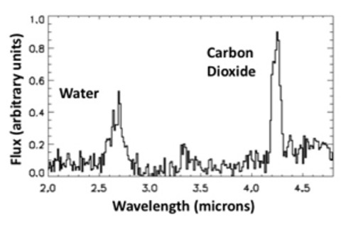 在上图——这是探测器飞掠期间拍摄的一张照片的增强版——您可以看到彗核喷射出的扇形物质。这些是喷流;从彗核喷射出来的物质。彗星由岩石和冰组成,当彗星靠近太阳时,热量可以将冰直接从固体变成气体。然后,这些气体从彗核的缝隙中喷射出来,形成这些喷流。EPOXI团队(包括我以前的老板Don Lindler!) 制作了一个精彩的动画,展示了这些喷流的活动。但这些冰是由什么组成的?许多我们通常认为是液体或气体的物质(水、氨、二氧化碳等)都存在于彗星中。在许多彗星中, 我们看到了大量的水,事实上,瑞典的Odin卫星 探测到 哈特利2号彗星每月喷射出约200千克(440磅)的水!那么,是水在驱动这些喷流吗?