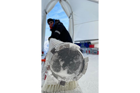 在格陵兰冰盖钻探时,冰芯桶中的冰(来源:Joseph McConnell)
