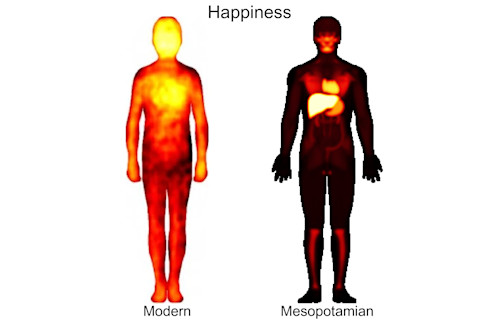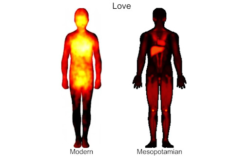 古美索不达米亚人和现代人情绪的另一个不同之处在于,现代人倾向于在上半身感受到愤怒,而古美索不达米亚人则相反;他们将愤怒感受在双脚。尽管两组人都会在心脏感受到爱,但古美索不达米亚人也将爱感受在肝脏和膝盖。