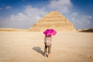 其他来源坚持认为,古埃及是雨伞的发源地,其例子出现在公元前 2450 年的埃及艺术中,由连接在木棍上的棕榈叶制成。如果属实,这些原始的遮阳伞可以同时作为该文化精英的扇子和遮阳工具。
