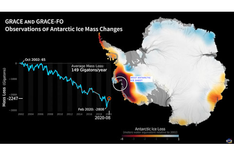 这张可视化图展示了2002年至2020年间南极冰层质量的变化,其中橙色和红色阴影表示冰层流失的区域,而浅蓝色阴影表示冰层增加的区域。西