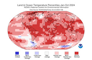在NOAA 175年的记录中,1月至10月的全球地表温度位居榜首,比1901-2000年的平均水平高出1.28摄氏度(2.30华氏度)。几乎可以肯定,2024年将是有记录以来最热的一年。(图片来源:NOAA)