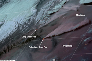 动画由GOES-16卫星获取的图像组成。罗伯逊德罗火灾位于画面下方,并产生更大的烟柱,穿过比灵斯。卫星图像包括红外数据,显示火焰产生的热量。截至6月17日上午,大火已烧毁了红木镇以南、怀俄明州边界以北24,273英亩的土地。