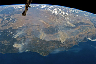 (图片来源:NASA) 从近300英里的高空俯瞰,可以看到加利福尼亚州的大规模森林火灾从美国西海岸向东飘散着烟雾和灰烬。这张图像的范围从南俄勒冈州(左侧)延伸至旧金山和锡埃拉内华达山脉(最右侧),超过500英里。宇航员瑞奇·阿诺德从国际空间站拍摄了这一景象,并于8月6日星期一在推特上发布了照片。其中最大的火灾包括(从左至右)俄勒冈州的泰勒溪火灾和克朗代克火灾,中间的卡尔火灾,巨大的门多西诺复合火灾,以及最右侧的弗格森火灾和其他靠近约塞米蒂国家公园的火灾。在全国范围内,超过28,000名消防员和支援人员正在与100多场火灾作斗争,这些火灾已经烧毁了约160万英亩的土地。仅卡尔火灾和门多西诺复合火灾就烧毁了超过40万英亩,或625平方英里的土地。为了了解烟雾的规模,可以将上图与谷歌地图上的这张图片进行比较。