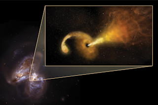 艺术家概念图描绘了当超大质量黑洞撕裂一颗恒星并喷射相对论性喷流时发生的潮汐瓦解事件(TDE)。背景图像是哈勃太空望远镜拍摄的 Arp 299 的图像,Arp 299 是本研究中发现 TDE 的碰撞星系。(致谢:Sophia Dagnello, NRAO/AUI/NSF;NASA, STScI)天文学家 Seppo Mattila 和 Miguel Pérez-Torres 通常研究恒星的自然死亡,但他们不愿意错过调查恒星谋杀案的机会。发表在《科学》杂志上的一篇新论文描述了他们如何获得了爆炸性证据,证明一个相对较近星系中的超大质量黑洞撕裂并吞噬了一颗恒星的一部分,这一现象被称为潮汐瓦解事件(TDE),在此过程中喷射出物质流。科学家们之前也曾观察到这些宇宙犯罪现场,但这是第一次有人设法获得如此详细的喷流及其随时间变化的结构的图像。