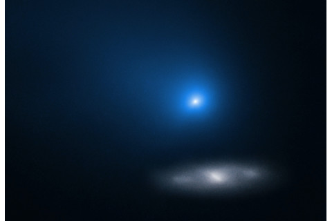 真材实料:2019 年,哈勃太空望远镜在它经过一颗遥远的螺旋星系前方时,拍摄到了星际访客“鲍里索夫彗星”(Comet Borisov)的图像。(资料来源:NASA/ESA/D. Jewitt-UCLA)