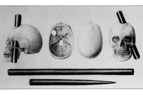 菲尼亚斯·盖奇(1823-1860)颅骨著名伤口的各种视图,显示了伤口和铁杆本身。他于 1860 年死于与脑损伤相关的癫痫发作。盖奇的案例帮助科学家们了解大脑不同部分的功能。Everett Collection/Alamy Stock Photo