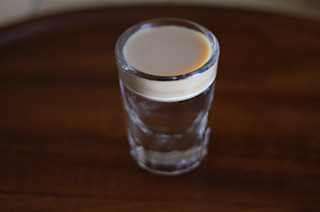 小心地将½盎司爱尔兰奶油倒在倒置的勺子背面,使其从勺子滑落并漂浮在利口酒表面。