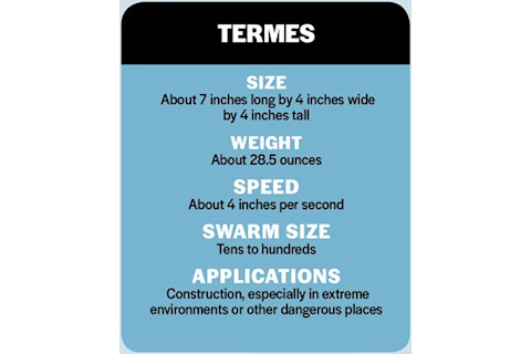 哈佛大学计算机科学家拉迪卡·纳格帕尔 (Radhika Nagpal) 和她在 TERMES 项目中的同事正在制造人造白蚁,它们可以像自然界中的同类一样,建造比自身大得多的结构。每台机器人大约 7 英寸长,4 英寸宽,看起来像一个倒置的独轮手推车,由四个“轮腿”(混合了轮子和腿)支撑。