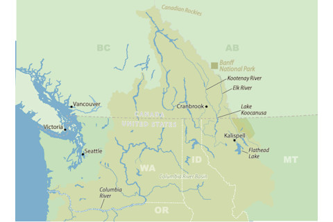 库特奈河(Kootenai River)(或加拿大边境以北的“Kootenay River”)发源于班夫国家公园路易斯湖著名的碧绿水域之外的一条山脊上的冰川圈谷。然后它向南流入蒙大拿州,在不列颠哥伦比亚省-蒙大拿州边境处膨胀成库卡努萨湖,像鱼钩一样弯入爱达荷州狭长地带,最后返回不列颠哥伦比亚省,在那里汇入哥伦比亚河。像太平洋西北地区的其他河流一样,库特奈河曾经充满了洄游的三文鱼和硬头鳟——直到20世纪初大坝开始拦截上游鱼群。现在仍有一些陆封的红大麻哈鱼,以及在两国都被列为濒危物种的古老鱼类白鲟。