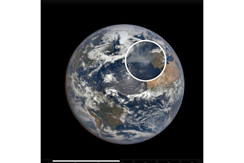 2023 年 6 月 26 日,DSCOVR 飞船上的地球多光谱成像相机(EPIC)从约 936,000 英里外拍摄了这张地球图像。图像放大部分显示了北大西洋和葡萄牙上空的野火烟雾。(来源:NASA)