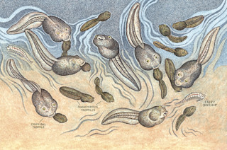 然后,两三天后,发生了一些奇怪的事情。一些微小的两栖动物经历了剧烈的生长爆发,它们的身体一夜之间膨胀起来。现在,当我手持捞网, wading,穿过天空牧场池塘(一个充满泥泞底部的泥坑,却自命不凡),这些膨胀的原始蟾蜍比它们那些啃食粪便的兄弟姐妹大四到五倍。