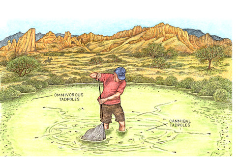 在三天的时间里,我在从轮胎压出的水坑到奥运会双宽型牛游泳池的水域中观察并捕捉蝌蚪。我从研究人员那里学到了很多关于三种两栖铲足蟾的信息,它们在这种危险且不可预测的条件下产卵。大部分信息都集中在这些生物的生态、行为和进化上。当然,同类相食的角度也存在,尽管这些研究人员认为这种行为是完全正常的。