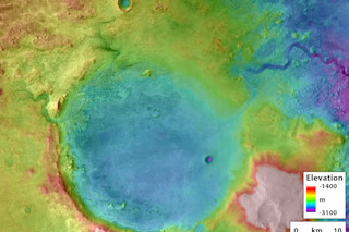 耶泽罗撞击坑是火星上的一个古老湖泊。其由溢流洪水雕刻而成的泄流峡谷,可以在撞击坑的右上方看到。(图片来源: NASA/Tim Goudge)