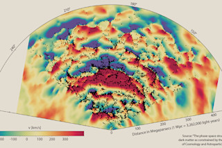 来自英国、法国和德国的宇宙学家绘制了暗物质在宇宙中运动的新地图。科学家无法直接观测到暗物质,它约占我们宇宙总质量的27%,因为它不与光发生反应。因此,这些研究人员不得不利用斯隆数字天空巡天项目(SDSS)的数据来推断其运动,该项目是一个持续进行的项目,旨在创建宇宙的3D地图。在此,研究人员将从SDSS中提取的星系位置(用黑色点标记)叠加在他们的暗物质数据之上。较暖的颜色代表朝我们方向运动的物质,而较冷的颜色则表示远离我们的物质。(来源:“SDSS 约束的附近暗物质的相空间结构”,宇宙学与天体物理学杂志,2017年)