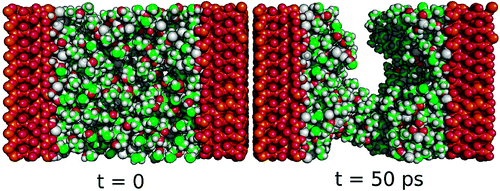 玻璃杯和桌子(均为红色)以及水/酒精混合物(绿色)在从桌子上拿起湿玻璃杯过程中的分子模型。