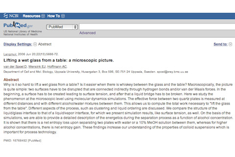 照片:flickr/bradleygee你有没有试过把湿玻璃杯从咖啡桌上拿起,结果却只是在桌子上滑动,因为它好像被吸住了?在这项研究中,三位物理化学家进行了大量的分子建模,以解释这种现象,包括询问酒精的“密封”效果比水更强还是更弱。结果表明,水和/或酒精分子之间分子相互作用引起的表面张力需要一定的力才能打破,而酒精所需的力小于水。作者认为,这具有重要的意义:“这项工作符合基础研究的道德准则。然而,结果可能具有严重的社会影响。我们注意到,从湿桌子上拿起玻璃杯所需的能量对于烈酒(酒精含量超过 40%,如图 10 所示)来说是最低的。因此,醉酒的人可能会想喝威士忌而不是水,因为它拿起玻璃杯只需要一半的力。然而,这一发现对酒精消费模式的影响超出了本文的范围。”从湿桌子上拿起玻璃杯:一个微观图像。 “为什么很难从桌子上拿起湿玻璃杯?如果玻璃杯和桌子之间有威士忌会更容易吗?从宏观上看,情况非常简单:必须破坏通过氢键和/或范德华力间接连接的两个表面。首先,必须产生表面,从而导致表面张力,之后必须打破液体桥。在这里,我们使用分子动力学模拟在微观层面上研究了这种现象。在不同的距离和不同的酒精/水混合物之间,测量了两个石英板之间的有效力。这使我们能够计算出“从桌子上拿起玻璃杯”所需的总功。讨论了该过程的不同方面,例如聚集和液体排序。我们将液体/玻璃界面的结构与液体/蒸汽界面的结构进行了比较,并给出了后者的模拟结果,例如表面张力。基于模拟,我们能够提供酒精浓度作为函数的分离过程中能量学的详细描述。结果表明,在分离两块之间有水或 10% MeOH 溶液的板时,会发生净熵损失,而对于更高浓度的酒精,则会发生净熵增益。这些发现增加了我们对胶体悬浮液性质的理解,这对于工艺技术非常重要。” 主要文本中的奖励图: