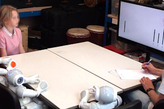 研究中用于对孩子施加同伴压力的社交机器人。(学分:Vollmer et al., Sci. Robot. 3, eaat7111)