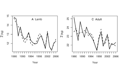该团队希望弄清楚绵羊体型缩小在多大程度上是由于自然选择的影响,以及在多大程度上仅仅是对不断变化的环境的生态反应。为此,他们开发了一个数学模型,用于分析他们 24 年的数据,并区分这些对比鲜明的影响。