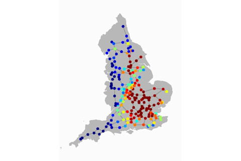该模拟显示了通过考虑与从英国伦敦大区传播的另一种流行病过程的合作,对源自英国利兹地区的其中一种流行病的最佳阻断。通过公路网络进行的传播对于牲畜流行病来说是很典型的,正如 2001 年英国口蹄疫那样(致谢:洛斯阿拉莫斯国家实验室)。