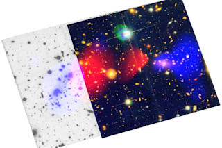 Bradac和她的同事们将星系团中可见物质的X射线图像与它们的总质量测量结果进行了比较。随着星系团的碰撞,可见物质(红色)似乎与总质量(蓝色)脱离了 alignment。如果暗物质不存在,图像中的这种分离就不会发生。“可见物质会卡在那里,而暗物质则不受影响地穿过,”她说。