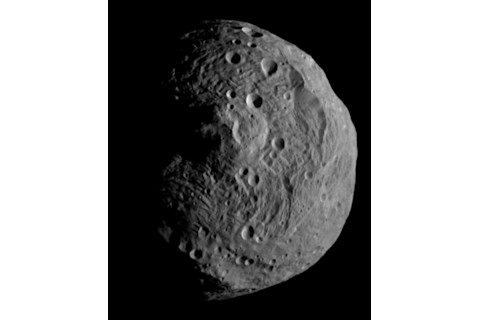 [点击以观察原生行星]。哇,真是个烂摊子!正如预期的那样,它遍布陨石坑,但有一些有趣的事情需要注意。一些陨石坑看起来非常深,而另一些则很浅——这表明撞击物命中的地形类型不同(小行星地貌?),(尽管在某些情况下这可能是一种光照效果;更直接的阳光角度会使陨石坑看起来很浅)。我之前在一篇之前的文章中提到的沟壑随处可见,其中一些现在看起来更像陡坡(悬崖)。看看右上方的那个巨大悬崖!我将非常想看到不同角度的那个区域。它是一个大盆地的一部分,还是一个塌陷特征?或者它是由表面破裂引起的悬崖?顺便说一句,中心向左投下阴影的那个凸起实际上是一座山或某种山丘,横跨超过100公里。分辨率令人惊叹;高分辨率版本中的每个像素大约有1.4公里(0.9英里)宽——小行星本身有530公里(330英里)宽。“黎明”号在距离16,000公里(9900英里;略大于地球的直径)的轨道上运行,并将随着时间的推移逐渐降低其轨道。维斯塔的质量尚不确定,因此工程师们采取了谨慎的做法,将其置于高轨道上。这将允许确定准确的质量,然后科学家和工程师可以计算出安全靠近所需的推力。这将需要一些时间,大约三周。在此期间,“黎明”号的科学家们将搜索维斯塔周围的区域,寻找微小的卫星。从未从地球上看到过任何一颗,但身临其境是无与伦比的。……而且我要补充一点,我们差点就没去成。早在2005/6年,这项任务实际上被NASA取消了,这引起了天文学界的轰动。然而,有人强烈反对这一削减,并且“黎明”号又回来了。经过漫长而漫长的旅程,它现在就在它应该在的地方:在深空中探索,进行科学研究,并扩展我们的前沿。我希望对JWST来说也是如此。
