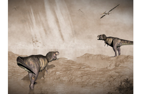 霸王龙和翼手龙正在观看墨西哥尤卡坦半岛的陨石撞击,该撞击形成了希克苏鲁伯陨石坑并导致了恐龙的灭绝。(图片来源:Elenarts/Shutterstock)