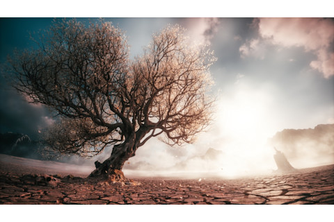 枯树和裂开的地球,上面有死去的植物。(图片来源:Alexander Steamaze/Shutterstock)