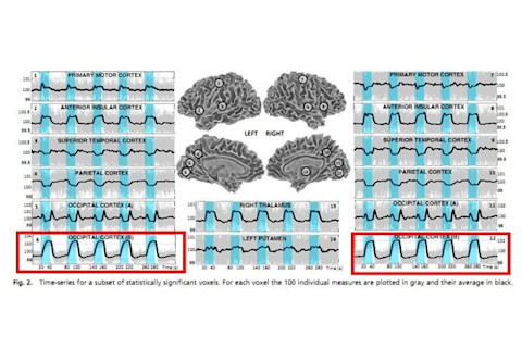 在这两种情况下,研究人员都发现,当人们执行简单的脑力任务时,与仅休息相比,几乎整个大脑都“亮了起来”——也就是说,显示出代谢活动增加。其中一个案例是观看人脸视频;另一个案例是判断屏幕上的刺激是字母还是数字。两项研究都使用了功能性磁共振成像(fMRI),它利用强大的磁场对大脑进行成像,并检测由不同区域细胞放电率差异引起的血液氧合变化。自该技术20年前开发以来,已发表了数千篇fMRI论文。其中绝大多数都产生了熟悉的“斑点”图,显示不同类型的心理过程涉及大脑特定部位的局部活动。然而,Thyreau和Gonzalez-Castillo能够检测到在这些神经影像学实验中太微小而无法察觉的效应,并发现不是孤立的斑点,而是大脑的大片区域都参与其中。这并不意味着每个地方对任务的反应都相同:在某些大脑区域信号更强,但在“活跃”和“不活跃”区域之间没有明确的划分。虽然新结果并没有推翻定位理论本身,但它们确实表明这只是部分情况。这些斑点是真实的,因为它们向我们展示了激活最强的区域,但如果认为这些区域是特定任务中唯一涉及的地方,那就具有误导性。其他激活,较小或不太一致但同样真实,则隐藏在统计噪音的阈值之下。fMRI实验可能只向我们展示了大脑活动的冰山一角。然而,关于这意味着什么,还有许多问题。一些神经科学家在评论这些结果时认为,通过包含如此大量的数据,这些研究可能过于强大——能够检测到如此微小的效应,以至于它们没有真正的科学重要性。另一些人则认为它们可能根本没有捕捉到微弱的大脑激活,而是由心率、头部运动或眨眼引起的微弱信号伪影。这些目前仍是悬而未决的问题。但Gonzalez-Castillo发现了另一个传统研究可能遗漏激活的原因:它们形状不正确。大多数fMRI分析只寻找遵循任务时间进程的激活:当你执行任务时它被激活,当你没有执行任务时它没有被激活。Gonzalez-Castillo发现大脑的某些部分确实遵循这种“方波”模式,例如初级视觉皮层V1区域(用红色突出显示)和丘脑。这是有道理的,因为这些区域已知是视觉信息处理所必需的。