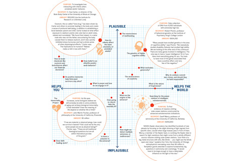 该基金会于2012年拥有25亿美元的捐赠,近年来其研究工作有所扩展,以覆盖更广泛的领域。2012年,坦普尔顿基金会授予了178项赠款,平均每项970,446美元。以下是我们对这些不寻常且繁多的努力的故意过度简化的指南。