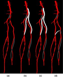 ASPIRE软件程序可以预测不同血管手术方案带来的血流改善,为外科医生在进行手术前提供新的知识。(1)这个动脉模型显示了临床问题。腹主动脉分支成供给腿部血液的两条股动脉,顶部灰色区域代表危险的堵塞。(下面的堵塞不是问题,因为它没有引起症状。)(2)新的白色分支表示分叉的旁路移植。这里将移植片连接到主动脉侧面,使血流在主动脉和移植血管之间分配。这个选择提供了最大化的总体血流,但可能产生血栓风险,因为血液在主动脉中流动缓慢。(3)外科医生通过端端吻合移植完全绕过主动脉,缝合主动脉的下部。这个手术提供的血流较少,但血栓风险也较低。(4)对于无法承受前两种选择所需开腹手术的患者,侵入性较小的股动脉到股动脉的移植可能是更安全的选择。图片由Charles Taylor提供
