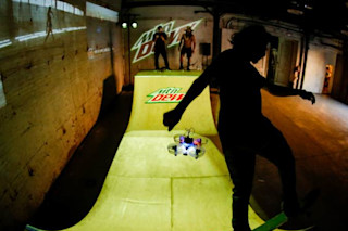 一款名为 Little Whoop 的微型玩具赛车无人机,在 DR1 无人机赛车推广活动中,在滑板运动员周围飞舞。摄影:Alexander Robertson 能够装进手掌的微型无人机,在布鲁克林一处改造过的仓库内,围绕着进行滑板技巧表演的滑板运动员飞驰。如果不是现场的俱乐部式灯光、投射在墙壁上的硕大 Mountain Dew(激浪)标志,以及震耳欲聋的音乐,人们可能会以为这是一个地下聚会。“无人机日”推广活动是为了宣传即将到来的无人机赛车比赛,DR1 Racing 是希望将无人机赛车打造成下一个主流体育项目的几家组织之一,他们推出了电视转播的赛车锦标赛和企业赞助。操控赛车无人机的人类飞行员佩戴第一人称视角(FPV)眼镜,让他们能够看到安装在无人机上的微型摄像头的视角。这种体验可能让人联想到《星球大战前传一:魅影危机》中的荚舱赛车场景,或是《星球大战六:绝地归来》中的陆地飞车追逐,尤其是在无人机穿过带有发光灯的定制赛道时。因此,无人机赛车吸引了现实生活中的冒险家、游戏玩家和科技爱好者,他们通常会自己制造赛车无人机以最大化飞行性能和速度。在 8 月 3 日于纽约布鲁克林 Bushwick 区的 1896 Studios 举行的 DR1 Racing 活动中,即使是第一次尝试的人也有机会试飞比典型赛车无人机更小的微型玩具无人机。“我喜欢跳伞,喜欢开快车,骑摩托车,我妈认为会让我送命的一切,” MultiGP 的创始人兼首席执行官 Chris Thomas 在“无人机日”活动的小组讨论中说道。“那些好玩的事情通常都很危险……我终于找到了既好玩又不那么危险的东西。” 企业赞助商和媒体网络已经开始支持无人机赛车,试图将这一小众爱好变成一项主流活动。DR1 Racing 获得了 Mountain Dew 的赞助,以及 Discovery Channel(探索频道)和在线直播视频平台 Twitch 等广播合作伙伴的支持。但 DR1 Racing 并非唯一致力于推动无人机赛车发展的组织。在另一项独立活动中,ESPN 签约转播了 2016 年 8 月 5 日至 7 日在纽约市总督岛举行的美国全国无人机赛车锦标赛。https://www.youtube.com/watch?v=XnutpyvMiUE