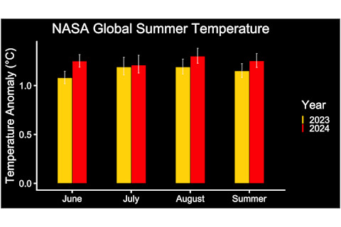 这张柱状图显示了2023年(黄色)和2024年(红色)夏季全球气温与长期平均值的差异。(白线表示估算温度的范围。)这些高于往常的夏季持续了由人类活动引起的温室气体排放驱动的长期变暖趋势。(来源:NASA/Peter Jacobs)