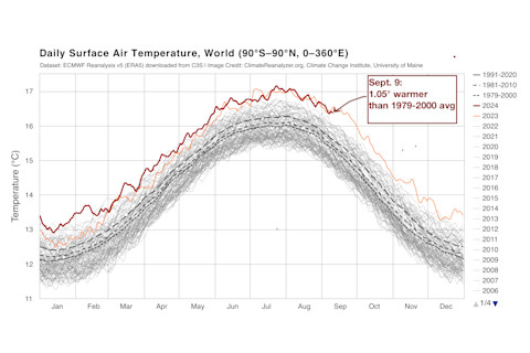 这张图显示了1984年至2024年9月9日全球每日地表空气温度的估算值。今年9月1日以来的温度与去年同期(当时每日记录正在被刷新)相当或更高。(来源:Climatereanalyzer.org)