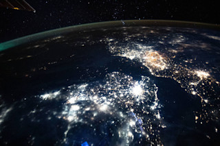 国际空间站(ISS)在热层中运行,距离地球约260英里。空间站的宇航员们描述了它每92分钟绕地球一周;因此,景色总是在不断变化。从国际空间站,宇航员可以识别蜿蜒穿过城市或森林的河流、闪烁的城市灯光以及从高空看像拼布被子的农田。