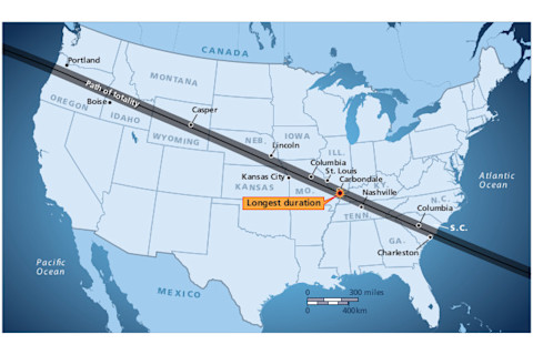 太平洋夏令时间下午2点47分,即登陆太平洋海岸一小时33分钟后,月亮的阴影将从南卡罗来纳州查尔斯顿以北的大西洋掠过。在此期间,它将触及13个州、五个州府和970万居民,还不包括数百万将前来观看的人。日全食——即太阳被月亮完全遮挡——从西海岸到东海岸只需93分钟。