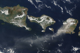 2015年11月5日,印尼林查尼火山喷出的火山灰羽。由Terra卫星的MODIS成像仪拍摄。