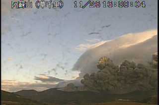 2014年11月26日拍摄的日本阿苏火山喷发羽流。图片来源:JMA网络摄像头捕捉自James Reynolds / Twitter。 日本阿苏火山新的喷发活动加剧,导致熊本进出港航班取消。阿苏山火山口是日本最活跃的火山群之一,自2003年以来,阿苏火山的中岳火山口一直有小型爆炸性喷发。然而,自8月底以来,活动强度有所增加。目前的活动持续产生羽流,高度达到1-2公里(3,200-6,400英尺)——观看今天的强烈爆炸性活动视频,包括火山上空飞越。目前喷发产生的火山灰已飘落至40公里外的城市。目前,日本气象厅(JMA)对阿苏火山保持2级警报(共5级),自8月初发现变形以来一直保持此级别。今天的Terra卫星过境也捕捉到了阿苏火山活动,棕灰色羽流向西南方向漂移(见下图)。