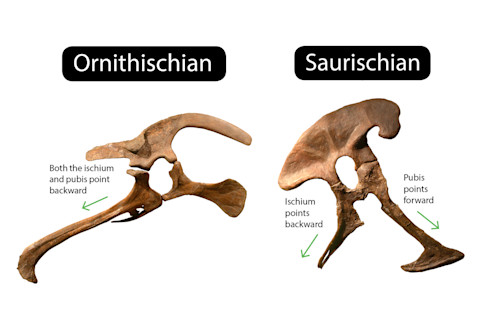 恐龙家谱上的第一次重大分歧发生在蜥臀目和鸟臀目之间——“鸟臀目”一词意为“鸟臀”,但这些动物与鸟类无关。这个术语指的是耻骨(一块骨盆骨)的位置:在基础恐龙和蜥臀目(“蜥蜴臀”)恐龙中,耻骨指向前方。但在鸟臀目中,它指向尾部,就像现代鸟类一样(鸟类在数百万年后才进化出反向耻骨)。