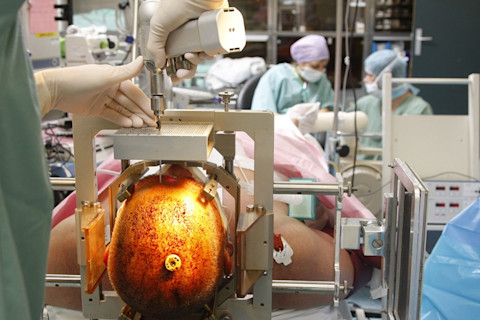 一名外科医生正在钻入患者头骨,为脑深部刺激做准备。BSIP/UIG via Getty Images