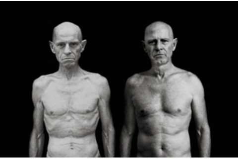 生物圈2号的科学家们很快意识到物资不足,并将每日卡路里摄入量减少了30%,这是人类第一次即兴的CR准实验。生物圈居民之一罗伊·沃尔福德领导了这项工作。他的体重从150磅(右)降至119磅(左)。(图片来源:Walford 等人,2002年,《老年学A系列杂志》)
