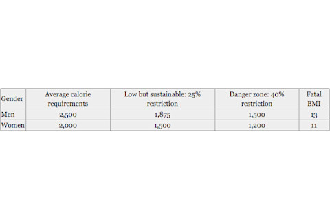 人们可以在没有食物和水的情况下生活数天,或者只喝水生活数周或数月。在实验动物中,当卡路里摄入量减少超过50%时,它们最终会死于饥饿引起的并发症。在饥饿的最后阶段,身体耗尽葡萄糖和脂肪酸,转而利用肌肉蛋白质获取能量。当人体质量指数(BMI)约为12时,人类就会死亡。