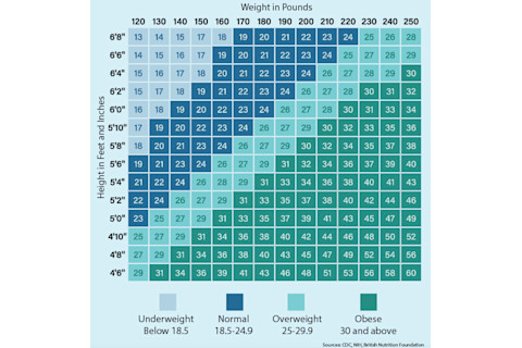 身体质量指数(BMI)利用身高和体重来衡量一个人的体重是否健康。(计算方法:体重(磅)乘以703,除以身高(英寸),再除以身高(英寸)。)尽管它不测量体脂,但BMI已被证明与代谢和疾病风险密切相关。一般来说,BMI达到30及以上或低于18.5的人,健康风险会增加。