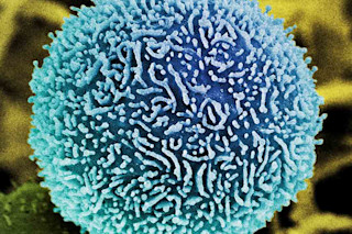 杀伤性T细胞(绿色)包围着癌细胞(蓝色),它们将通过储存在囊泡(红色)中的化学物质杀死癌细胞。(来源:Alex Ritter, Jennifer Lippincott Schwartz and Gillian Griffiths/National Institutes of Health)